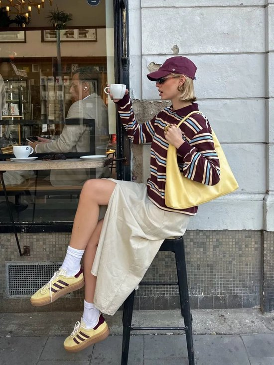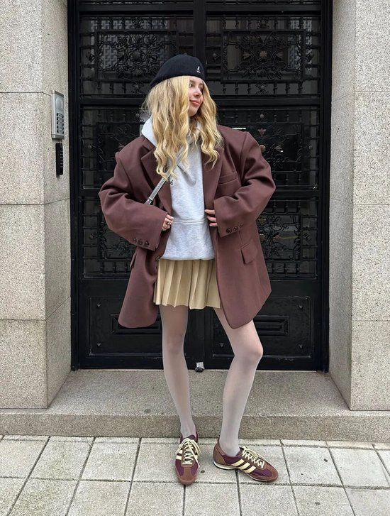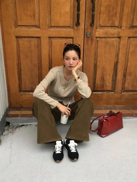 复古球鞋搭配阔腿裤或长裙,内搭Oversized衬衫,外套则是一件长款风衣或西服,既保持专业度又不失时尚感。建议选择焦糖色或黑白配色,更显高级。