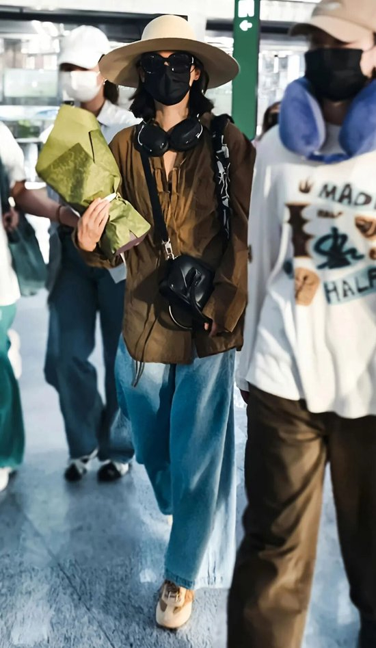 辛芷蕾拿奖回来,脚踩Roger Vivier米色运动鞋,搭配褶皱衬衫与阔腿牛仔裤,再用宽檐帽、墨镜加持,复古优雅中透着随性高级。