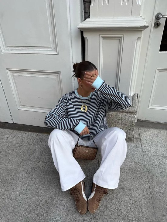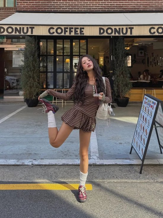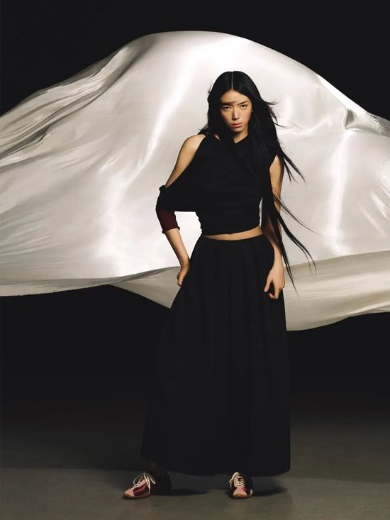 而在另一套造型中,她选择Dries Van Noten咖色薄底德训鞋为核心,搭配条纹Polo衫与牛仔阔腿中裤,复古松弛又显利落,日常好借鉴。