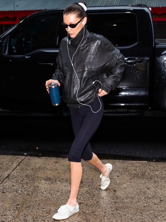 薄底德训鞋搭配廓形套装,内搭可选择紧身或crop top露出腰线,打破套装的沉闷感,营造干练又时髦的职场形象。