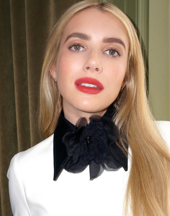 充满热情的橙红色晕染在双颊与嘴唇上,提升了整体妆容的明亮度,充满了高调又明媚的富家千金气场,而自然的浅棕色眼妆搭配唇颊温柔的裸粉色,整体妆容展现出一种低调的奢华感,这两个色系都是艾玛·罗伯茨日常最常用的唇颊色系。